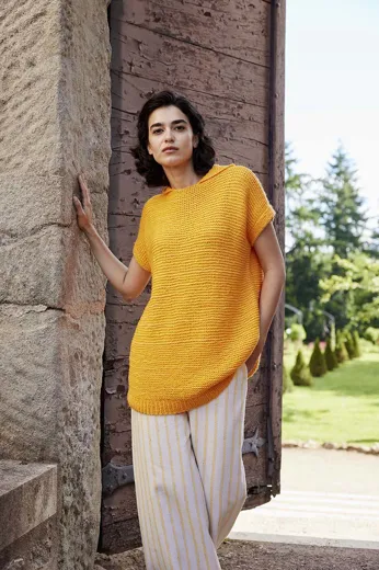Kurzarm-Pullover mit Kapuze in kraus rechts gestrickt mit GLOW (Viskose Lyocell, Baumwolle organic, Polyamid)