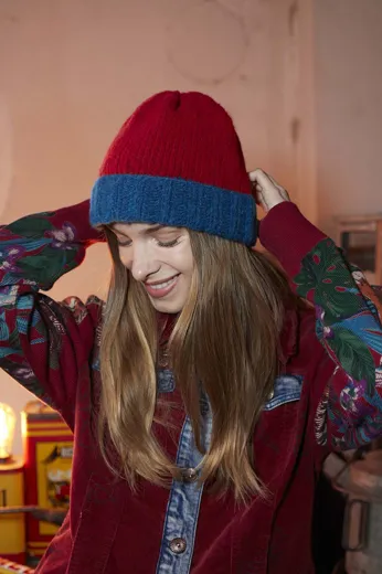 Zweifarbige Mütze in glatt rechts und Rippenmuster gestrickt aus WOOLADDICTS AIR mit Merino extrafine und Polyamid.