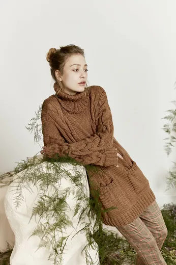 Langer Rollkragen-Pullover mit Taschen in glatt rechts und Zopfmuster gestrickt aus CARPE DIEM mit Merino und Alpaka.